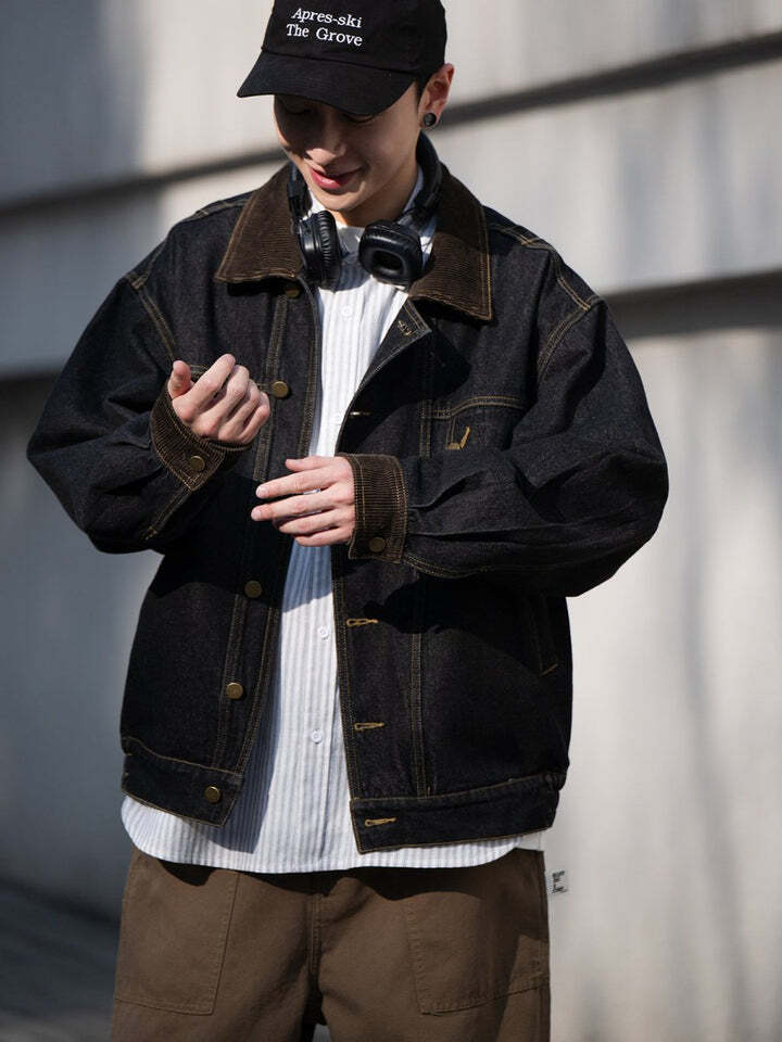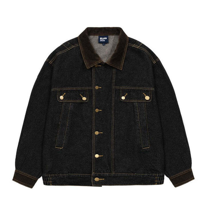 このデニムジャケットは、カジュアルながらも洗練された印象を与えるアイテムです。コーデュロイ素材の襟が特徴的で、クラシックな雰囲気を醸し出しつつ、現代的なスタイルにマッチします。