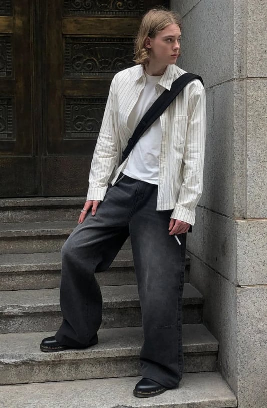 膝下から裾にかけてゆるやかに広がるシルエットは、スニーカーはもちろん、ドクターマーチンなどのボリュームのあるブーツとの相性も抜群。バギーパンツのトレンドを取り入れながらも、すっきりとした腰回りで大人っぽい着こなしを実現できます。