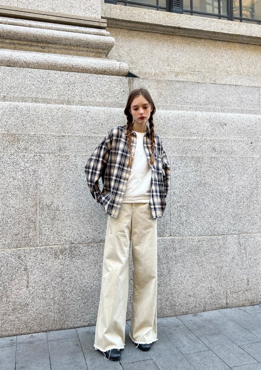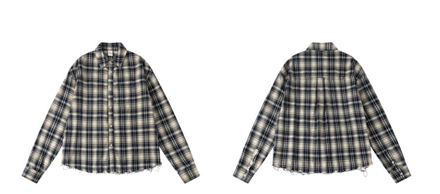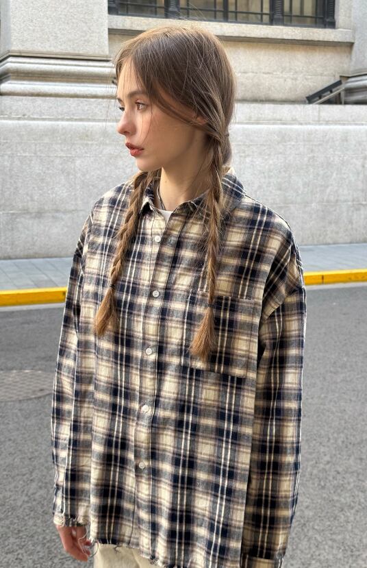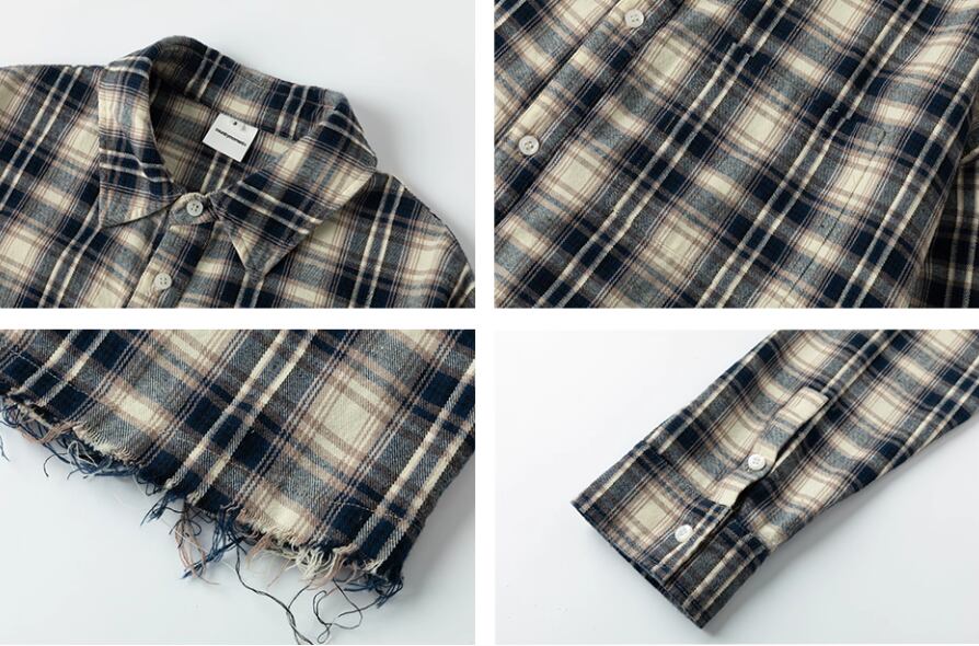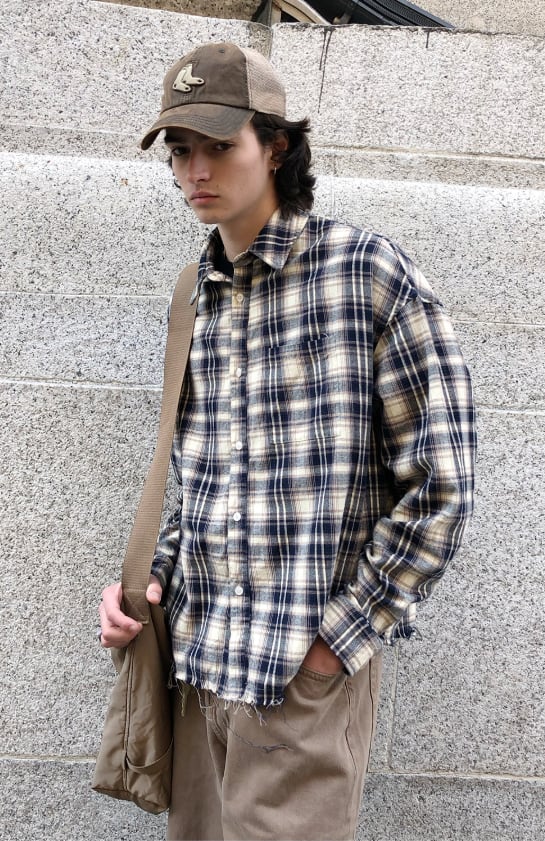 プレミアム綿使用 ダメージ加工 グランジチェック長袖シャツ KN043