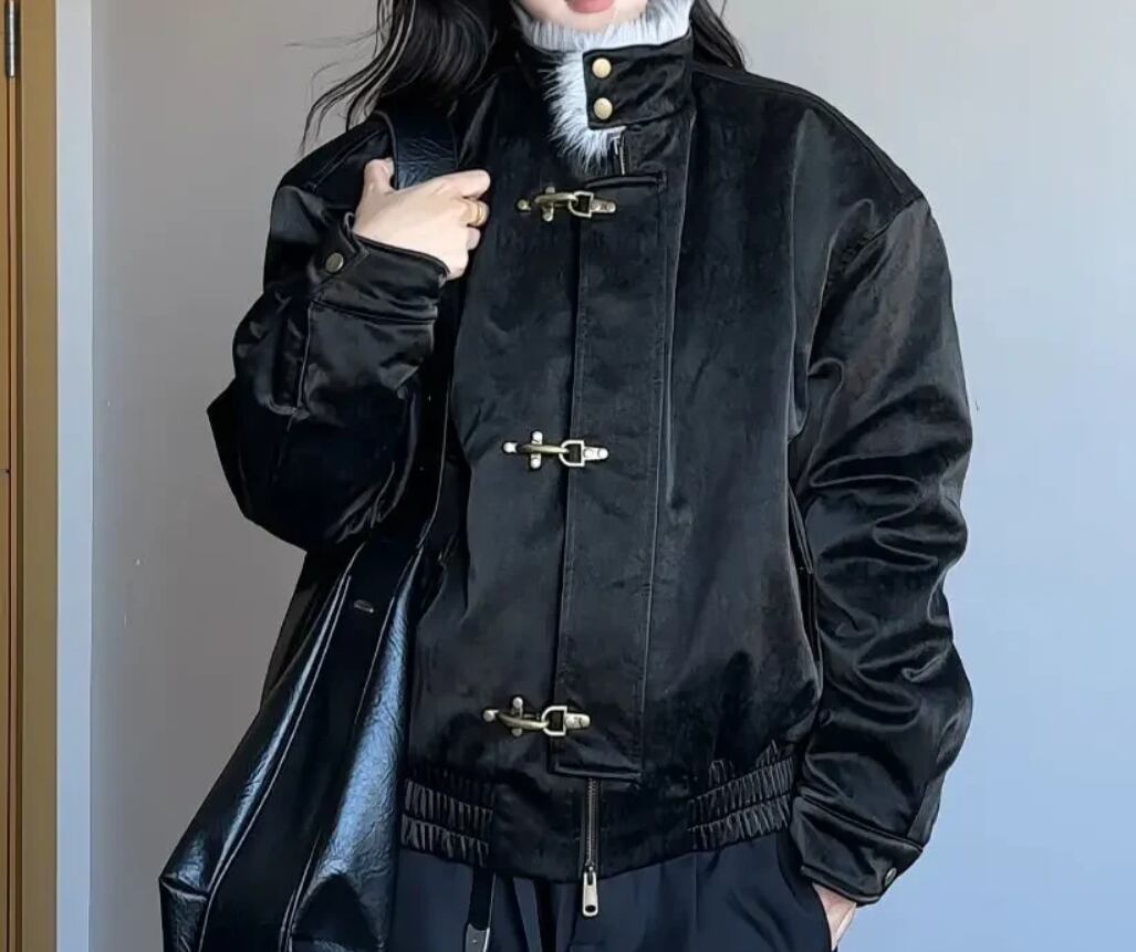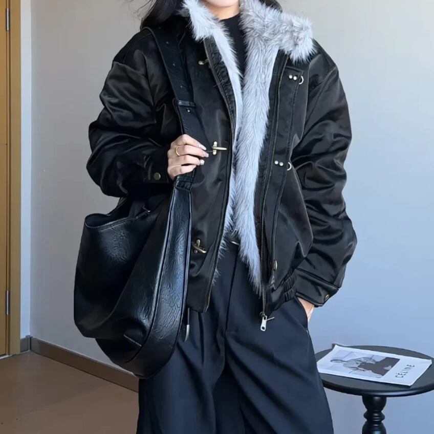 表地には上品な艶をまとったパールレザー調素材を採用し、光の角度で柔らかく陰影が揺らぐリッチな質感を表現。内側には中綿をしっかりと封入し、防寒性と軽さを両立。ボリューム感のあるシルエットながら、肩の落ち具合や丈のバランスが絶妙で、羽織るだけでスタイルに深みが生まれます。