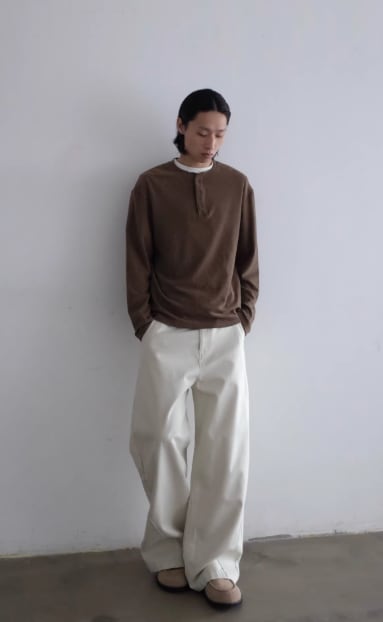 ヘンリーネックのボタンは、開け方で印象を変えられるデザイン。
