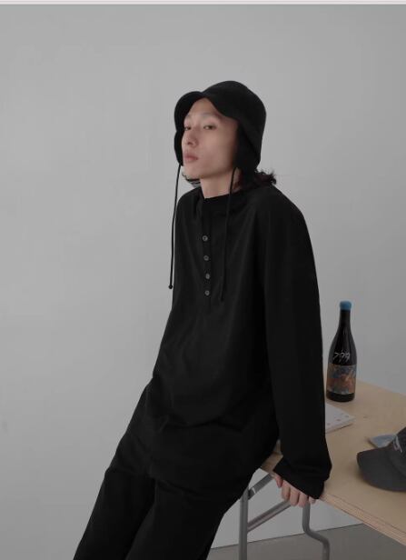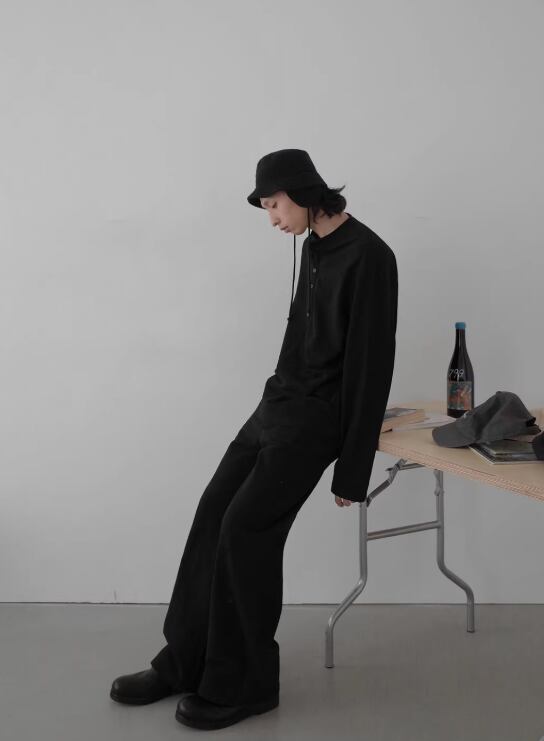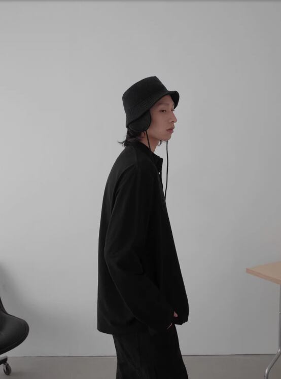 ヘンリーネックのボタンを閉めると落ち着いた印象に、