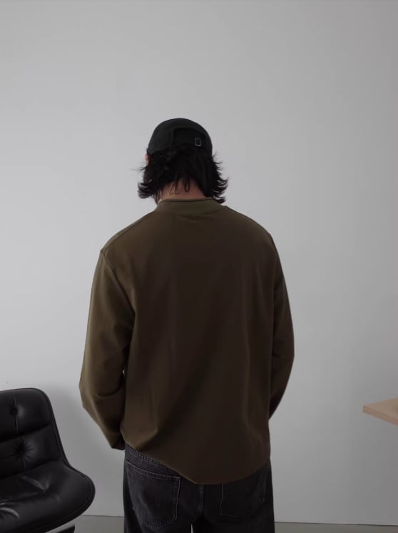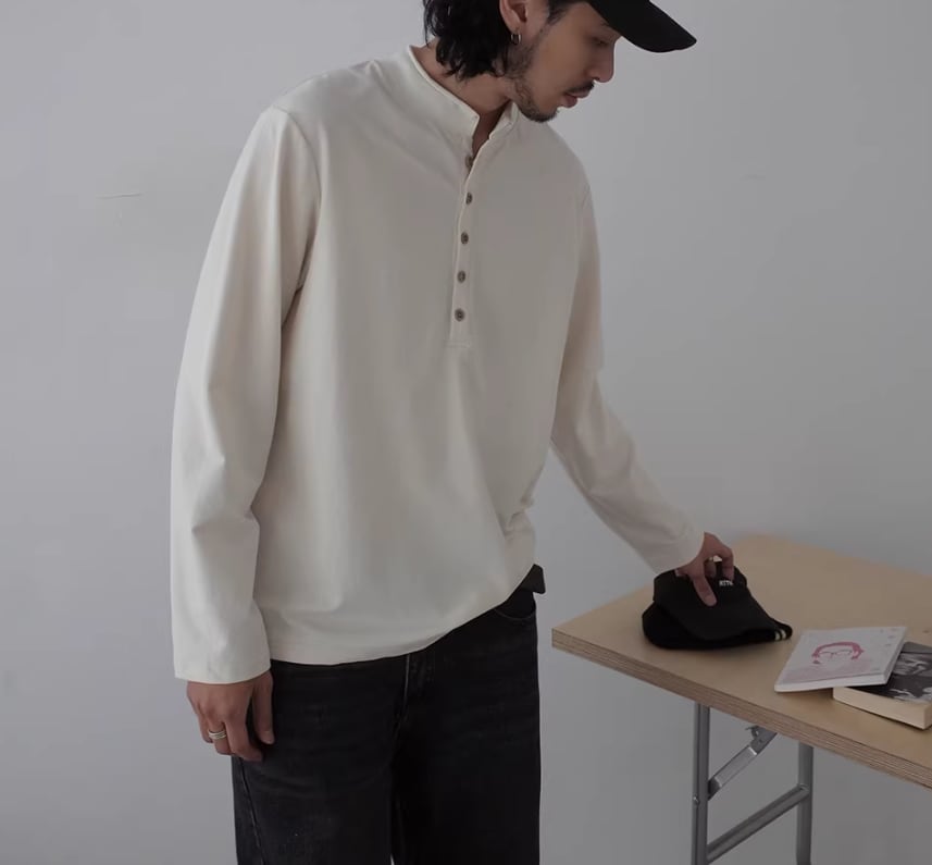 やわらかい生地感で気軽に着られる、ヘンリーネックのロングスリーブTシャツ。