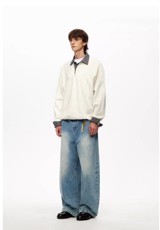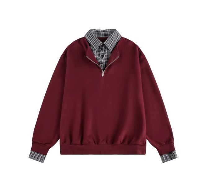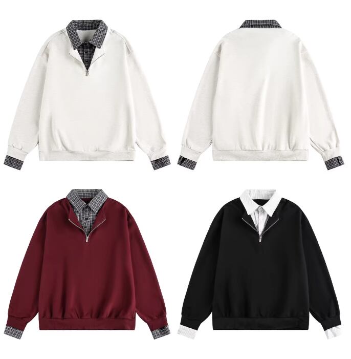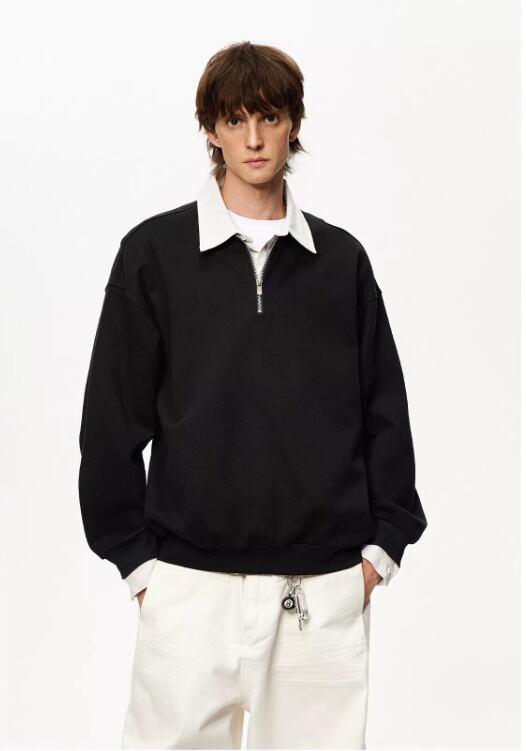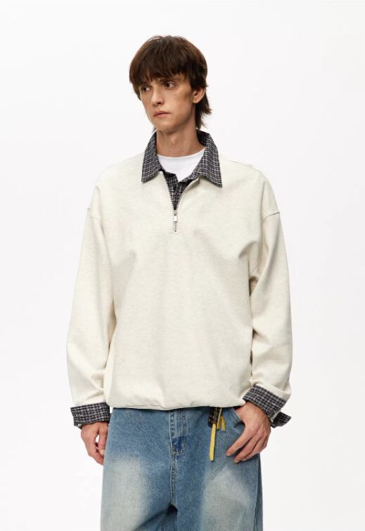 シャツを重ねたように見える、フェイクレイヤード仕様のハーフジップスウェット。