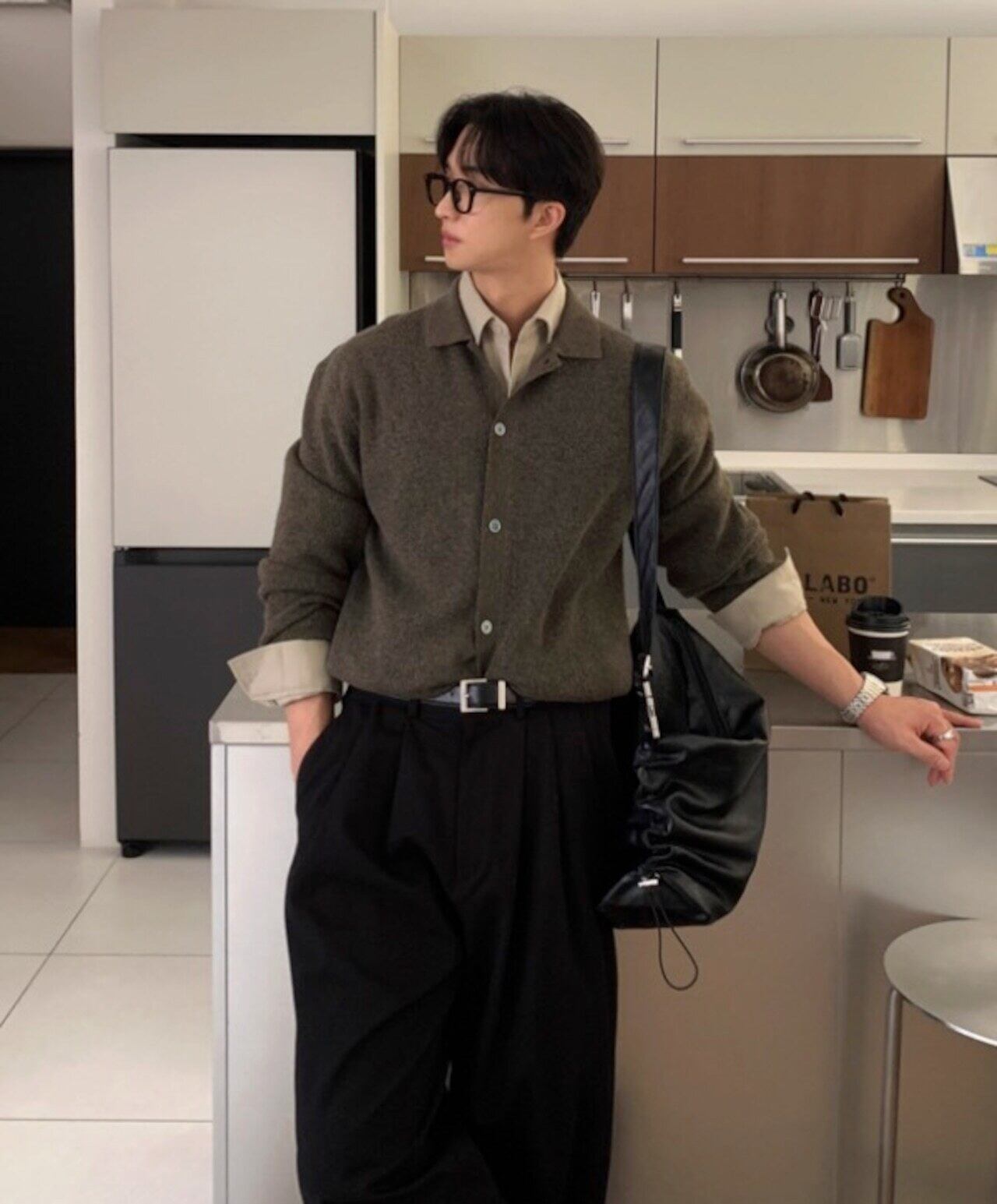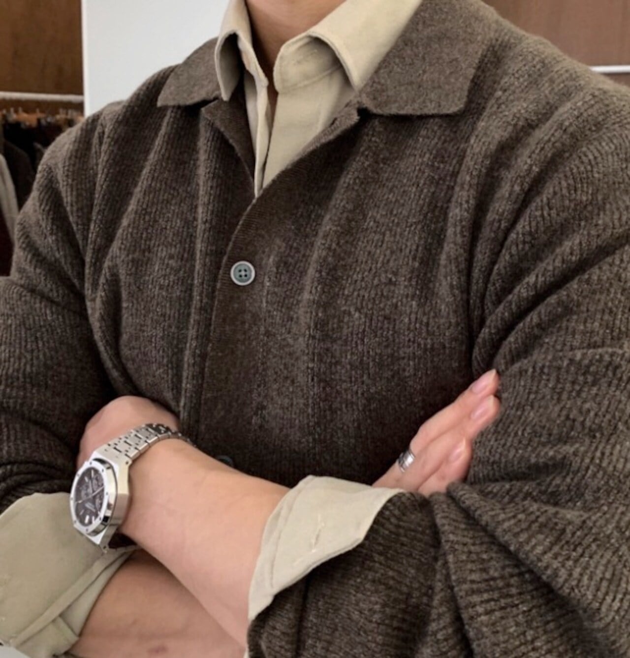 カーディガンの気軽さに、ポロニットの落ち着いた雰囲気を合わせた一枚です。