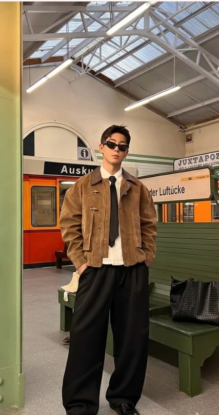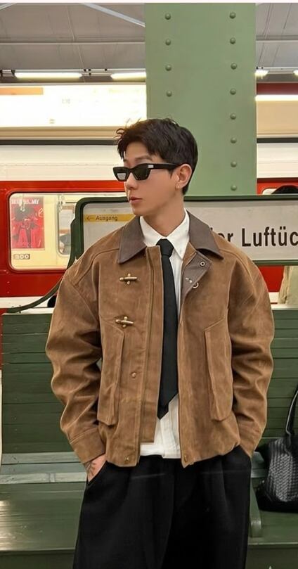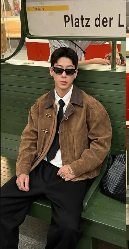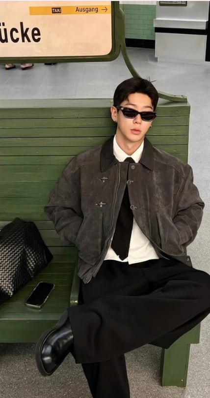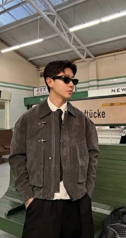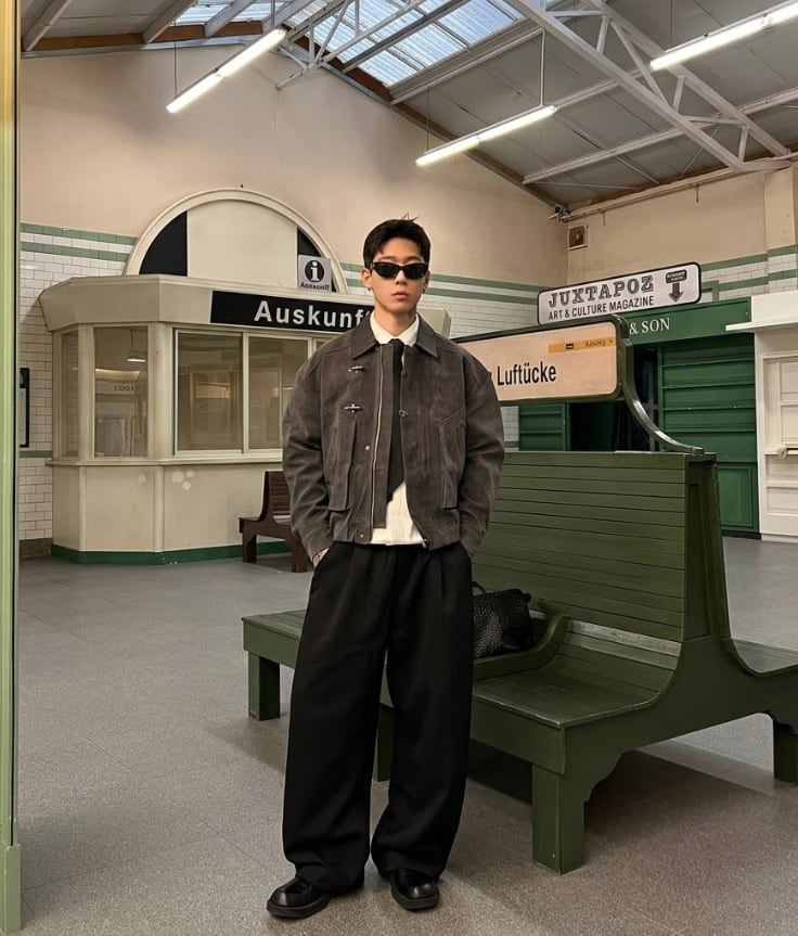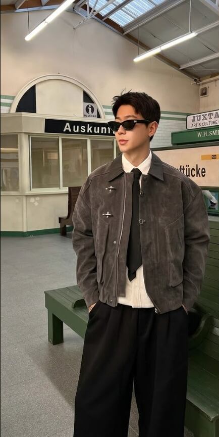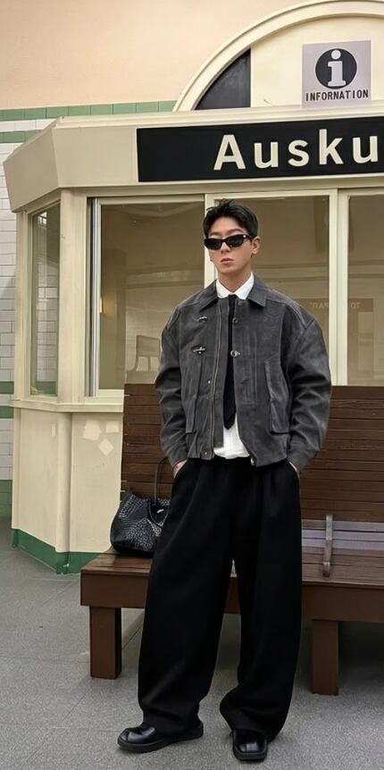・黒ヘンリーネック × ワイドデニム → ジャケットを主役にしたシンプルスタイル